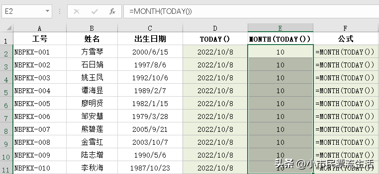 其中 =MONTH(TODAY()) 部分获取TODAY()结果当前日期2022年10月8日中的月份 10。如下图