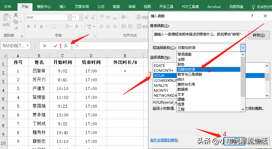 选择E2单元格输入 = 后,如下图 以此选择 插入函数 *fx*标识,在弹出的插入函数对话框,选择类别单击*日期与时间*类别函数,在选择函数列表中单击*HOUR*函数,最后单击*确认*。