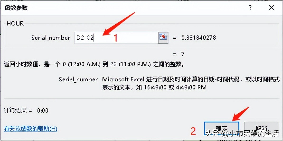 在函数参数对话框 serial_number 参数编辑栏输入*D2-C2* ,单击*确认*。