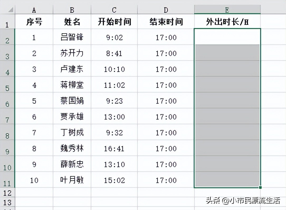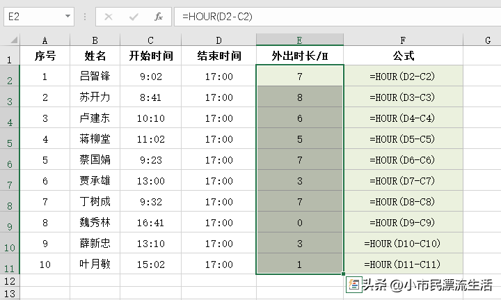 将鼠标光标移动至E2单元格右下角,光标变成+时,按住鼠标左键向下拖动至E11单元格,此时E2:E11区域单元格返回的值就是员工的外出时长的小时数。