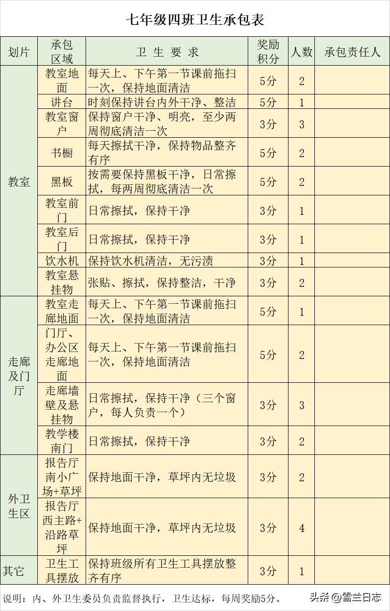 说明:该数据相对固定,由初期班级卫生招标承包时确定奖励积分,一般为每周3-5分,越难打扫和保持的区域如外卫生区楼梯等,承包奖分越高,比较容易清理的如楼道走廊,承包奖分略低。特殊区域承包如卫生间、擦墙裙等,按劳动量和花费的时间精力确定合理的奖分。