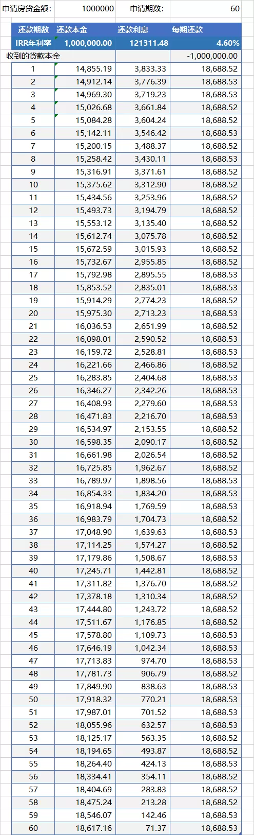 现在就以商业按揭贷款1000000.00元,商贷支付利息:121311.49元,贷款期限5年,分60期还清,每月等额本息还款18688.53元。