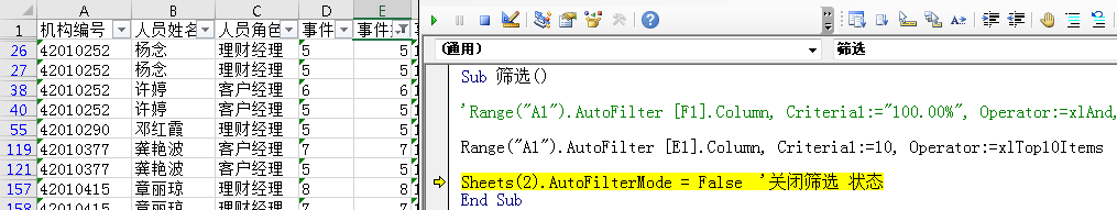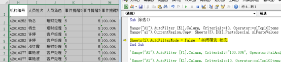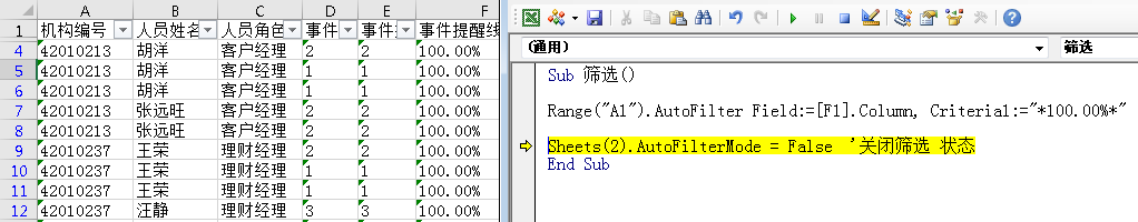 Field 指筛选哪一列的列序号,示例:Range("A1").AutoFilter Field:=[F1].Column, Criteria1:="*100.00%*"