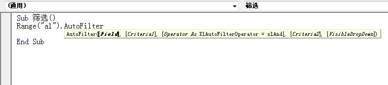 Range().autofilter 语法:Range().autofilter field,Criteria1,operator,criteria2,visibledropdown