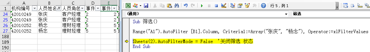 5、xlfiltervalues 筛选值,配合数组array使用。例:Range("A1").AutoFilter [B1].Column, Criteria1:=Array("张庆", "杨念"), Operator:=xlFilterValues