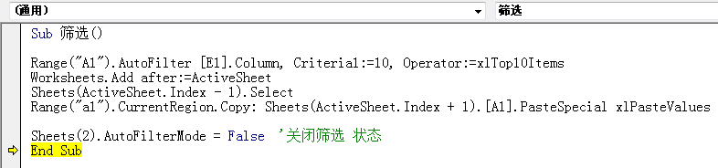 3、xltop10items: Criteria1:=10,xltop10items 筛选值排在前10的数据;Criteria1:=5 就只筛5项。例:Range("A1").AutoFilter [E1].Column, Criteria1:=10, Operator:= xltop10items