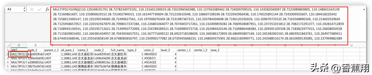 以上均数据WKT的边界数据,那当我们遇到这个数据的时候一般为Excel数据,举例如下: