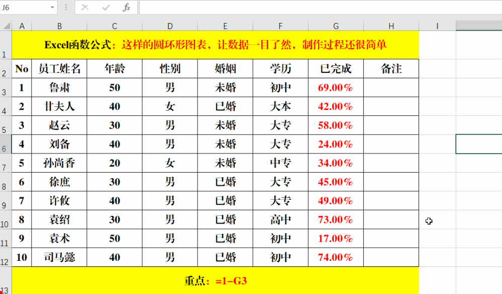 2、在“未完成”列的目标单元格中输入公式:=1-G3并Ctrl+Enter填充。