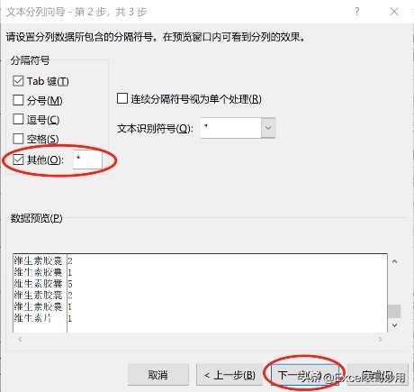 (3) 在分隔符号中选择”其他”,并在后面空白处输入分隔符号”*”,点击下一步;表哥Tips:如果”品名”与”数量”之间由”@”连接,则空白处分隔符号输入”@”。