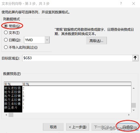 (4)这里选择”常规”(若分列数据包含日期,则选择日期格式即可),点击完成。