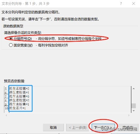 (2)在”分列”向导窗口中选择”分隔符号”,点击”下一步”;
