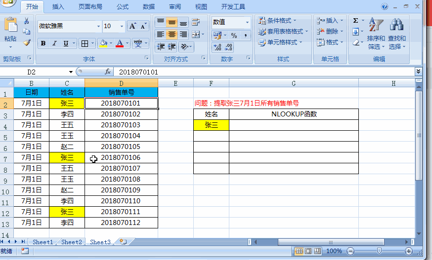 问题:提取张三7月1日所有销售单号
