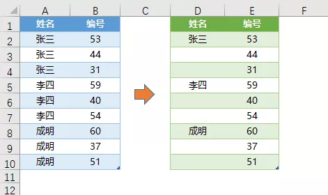 如下图,将下面的数据向下填充逆过程。即将左侧的数据转换至右侧的数据。