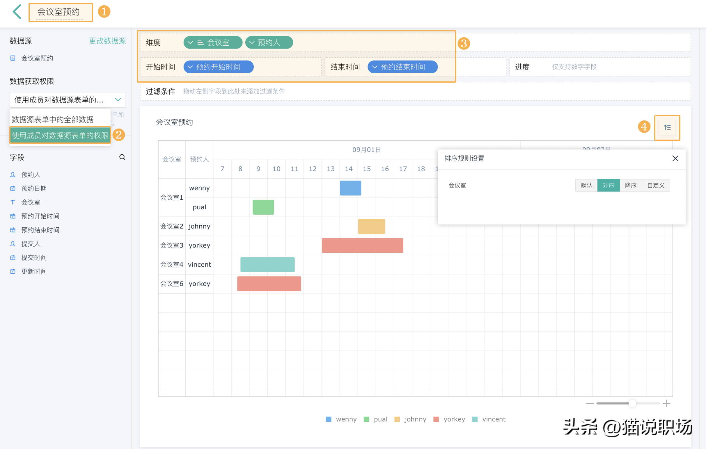 3)修改组件名称>> 数据获取权限选择 「使用成员对数据源表单的权限」 >> 设置维度和起止时间>> 设置排序规则;按下图步骤设置甘特图。