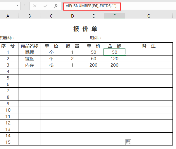 照样用上一个例子,我们F列的公式还可以写作:=IF(ISNUMBER(E6),E6*D6,"")