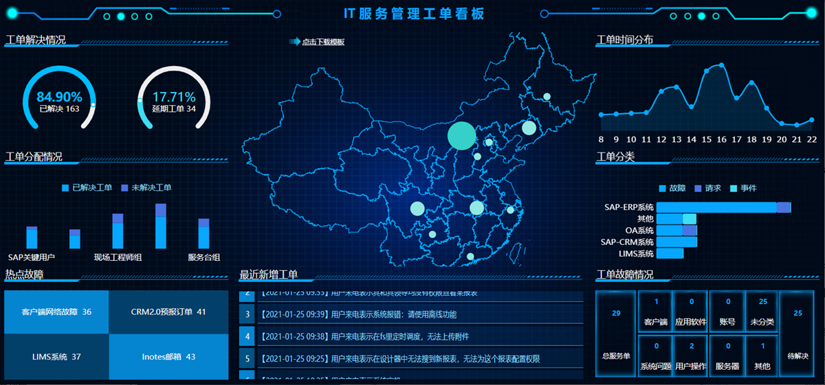 IT 运维部门经理,想把服务工单数据可视化,方便定期查看部门工单数据的同时,希望能从工单数据中发现问题,及时做出反馈并解决