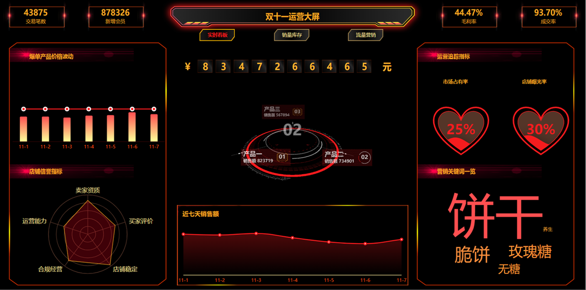 店铺双十一运营数据展示,较多数据可通过按钮切换展示。包括实时销售额分析,销量库存分析,流量分析