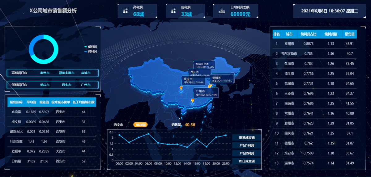 展示各城市利润占比,销售量等数据,地图和下方折线图联动,可动态展示各城市的销售额和利润情况。该模板可用于零售行业统计各产品、各城市销售情况