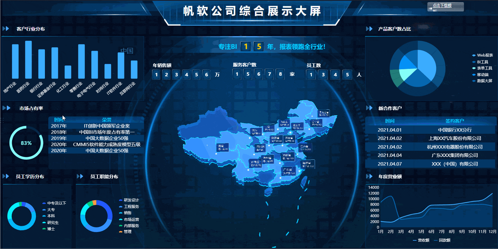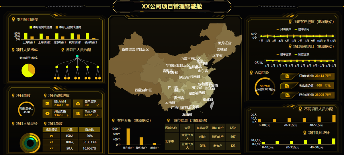 作为项目管理驾驶舱,全国业务地图与图表,报表块实现点击联动,项目人员分配签单,签单统计,拜访客户进度一览无遗