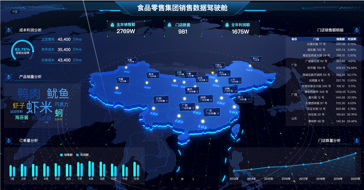 从各个维度分析掌握集团零售业务详情,轮播三维组合地图,区域销售额一览无遗,高端大气上档次的轮播动画效果,让您的大屏更加炫酷!!!