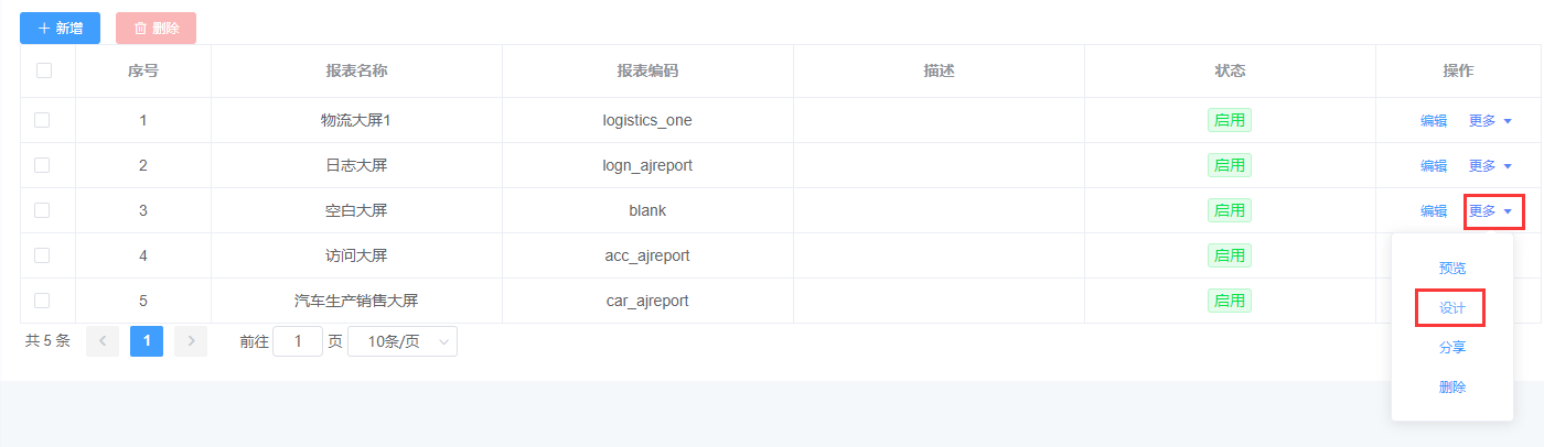 从报表管理模块选择需要设计的大屏,按图示进入大屏设计界面