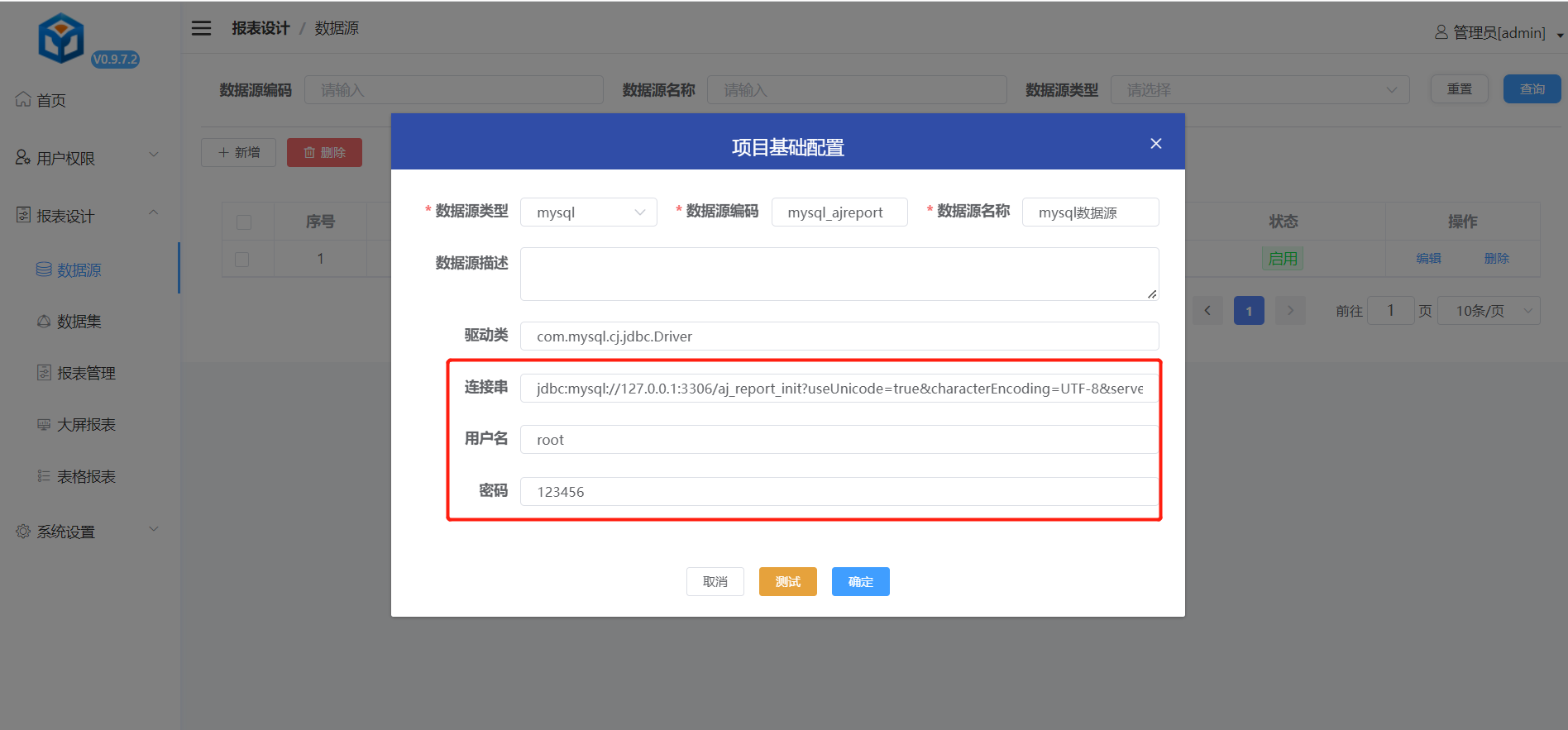 报表设计-->数据源 --> mysql数据源 --> 编辑 --> 修改用户名密码(改成你自己系统mysql的用户名密码)