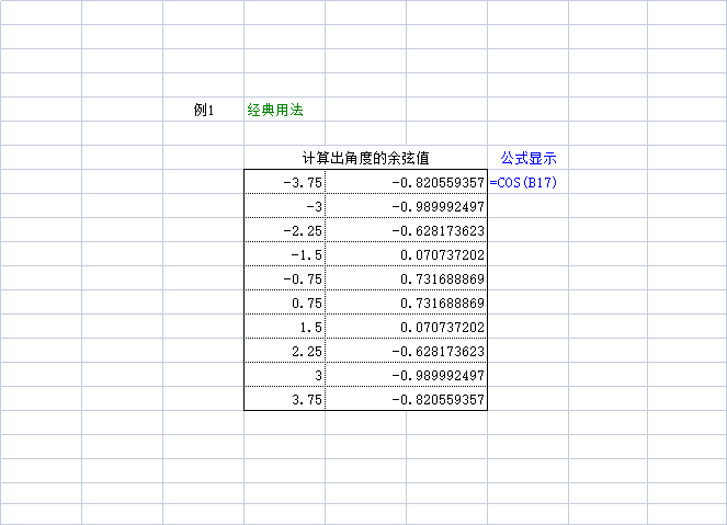 官方说明: 返回给定角度的余弦值,余弦(余弦函数),三角函数的一种。