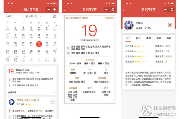 平时少不免查农历日子,而这个朝夕万年历的界面十分简洁明了,进入程序就可以看到农历、农历日子的忌宜,还有星座运程。如果要看更具体内容就点入相关功能栏即可。