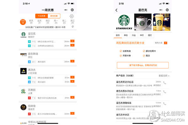 你点进小程序,通过定位,可以搜到附近哪些商家是使用某银行卡可以有什么折扣或优惠,就像上图的星巴克那样。
