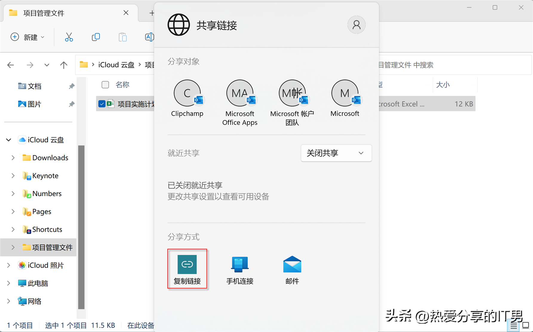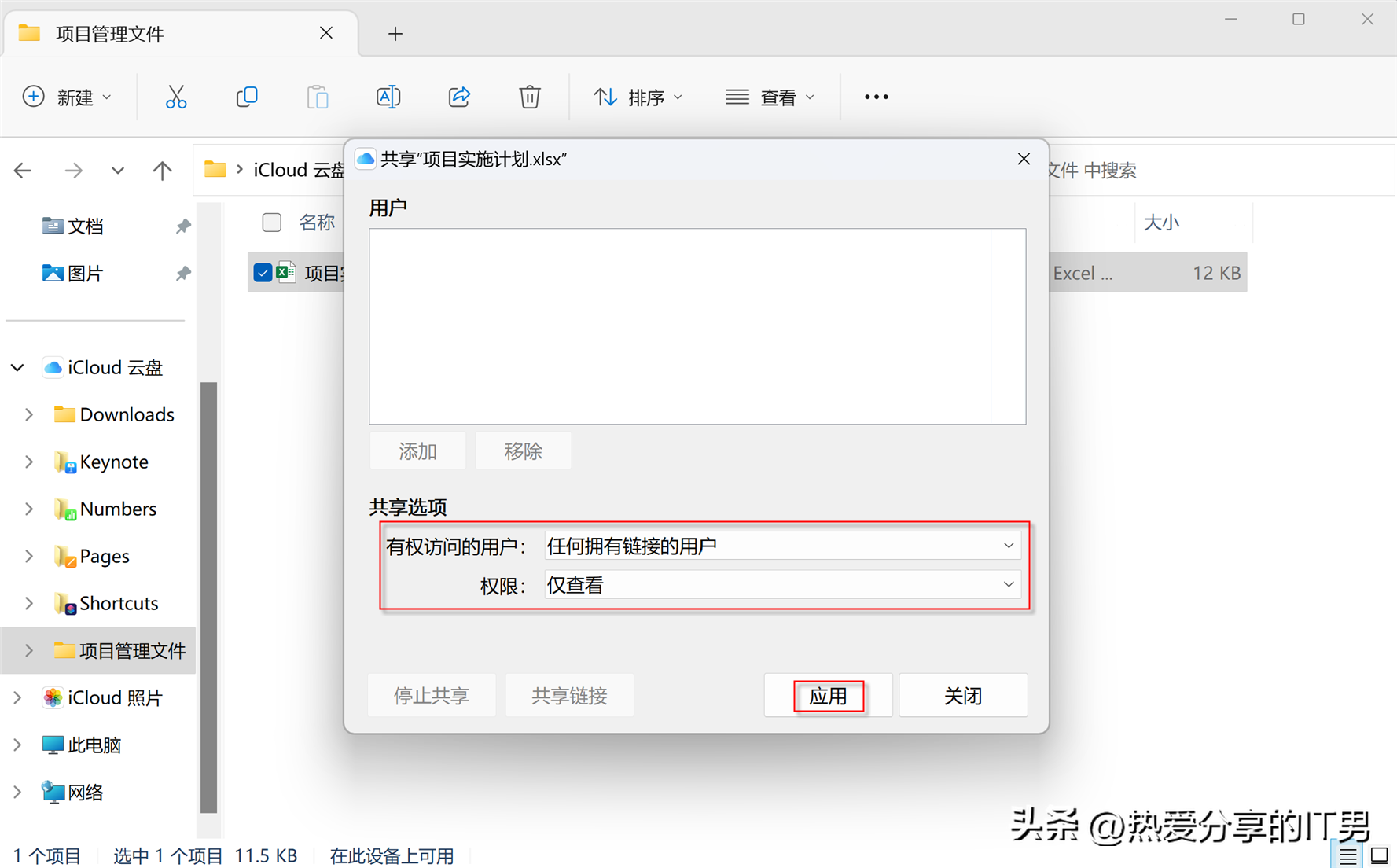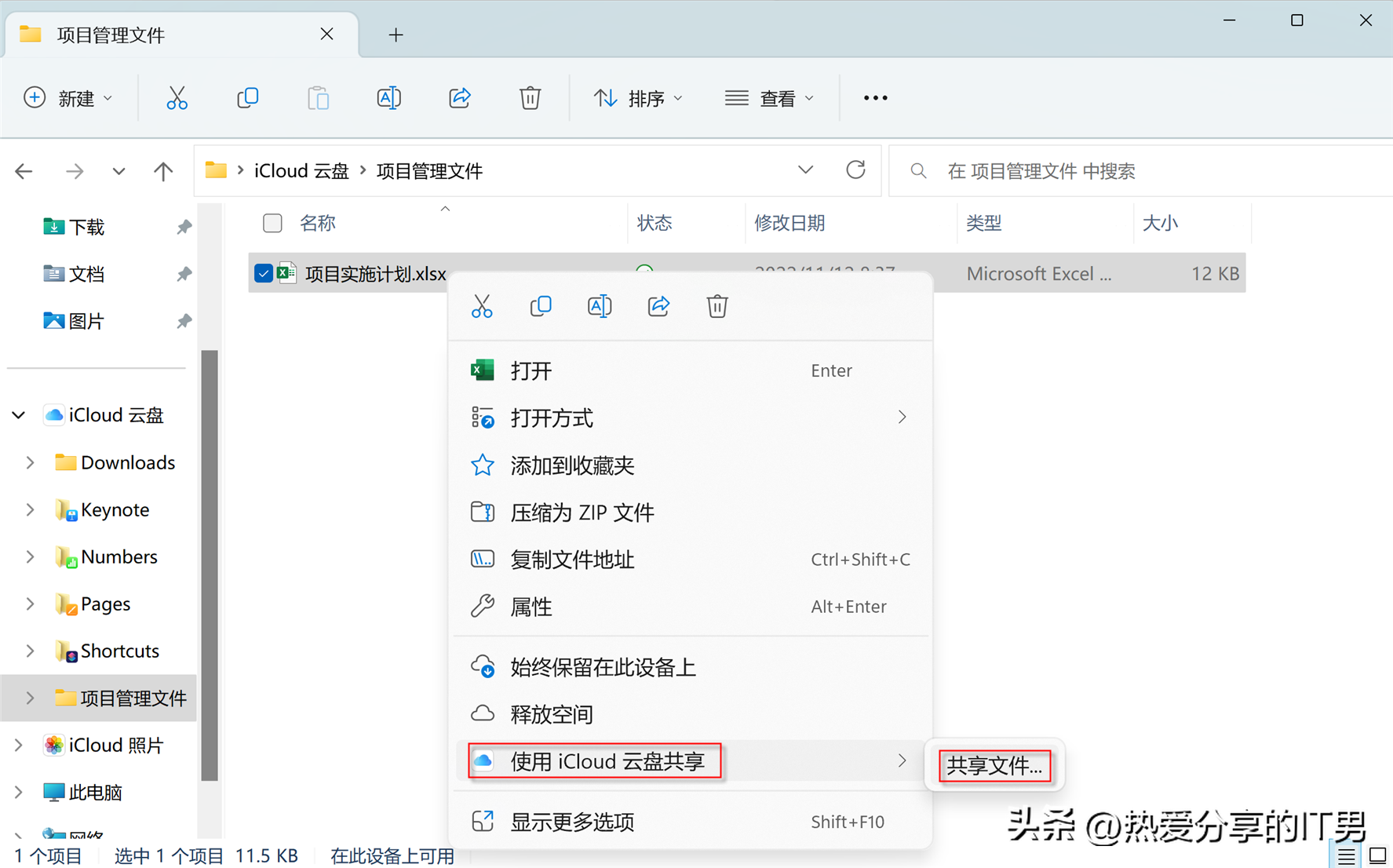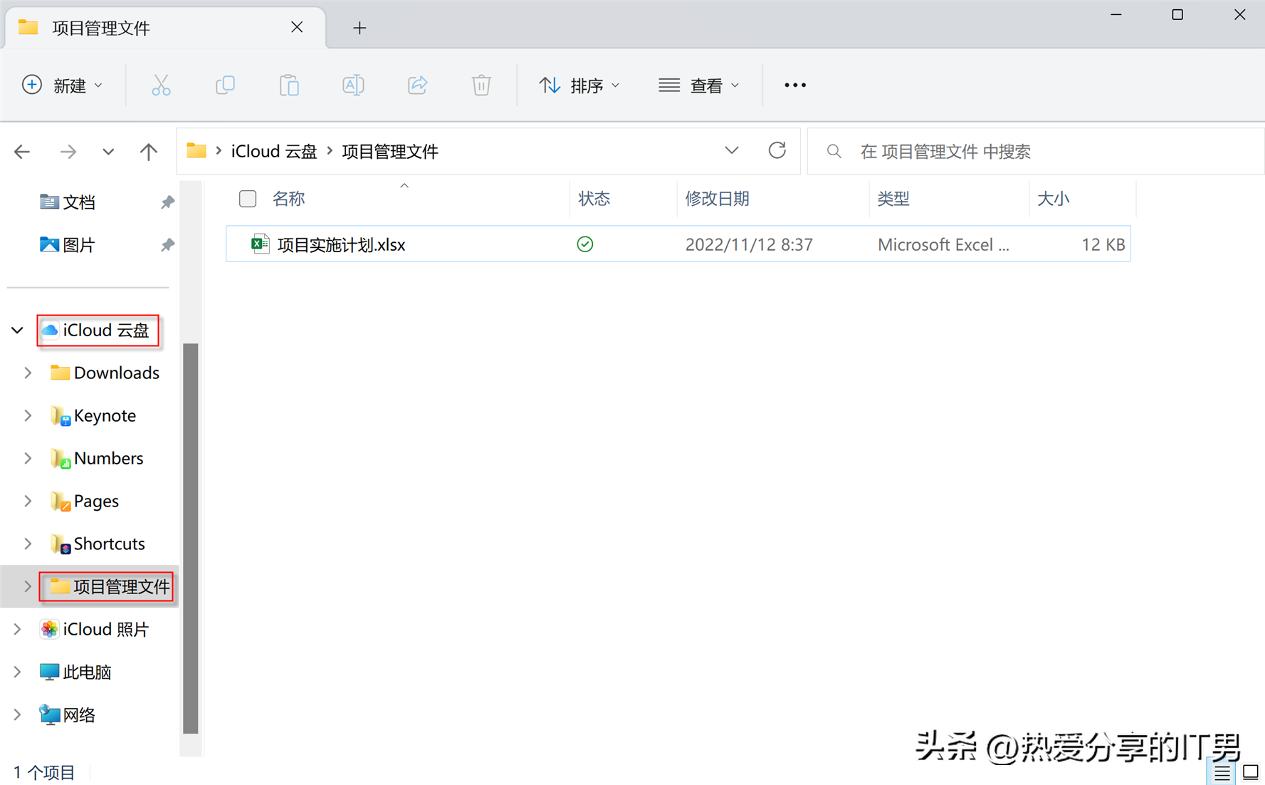 1、打开 Windows 文件资源管理器,点击窗口左侧导航栏的“iCloud 云盘”下的“项目管理文件”,可以看到右侧已列出一个名为“项目实施计划”的Excel文件,这个文件目前状态显示为已同步,但没有蓝色带圈的人像图标,表明目前未处于共享状态。