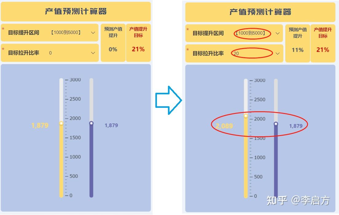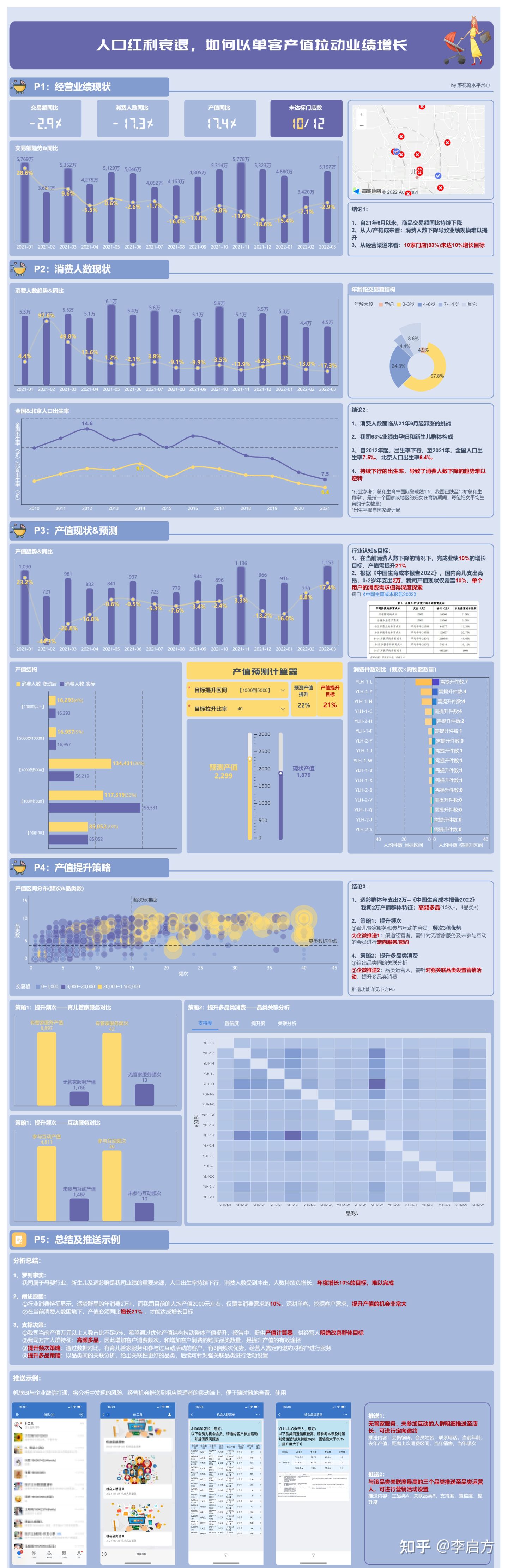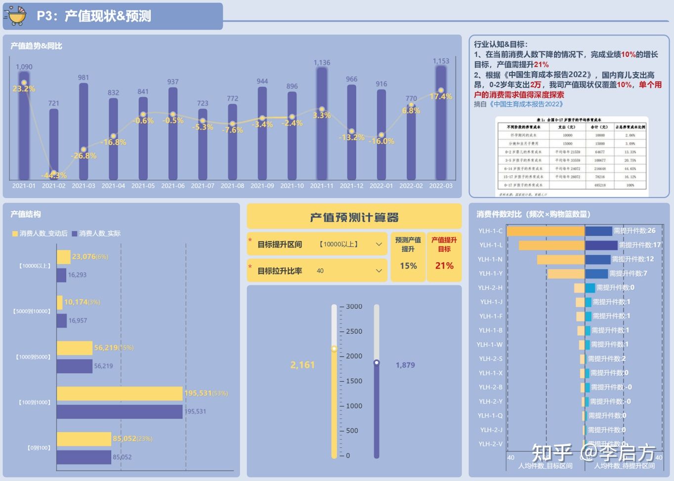 ③part3-产值现状及预测:在消费人数难以提升的情况下,为了实现业绩的增长,需要以提升产值来拉动;通过行业报告了解到0-2岁年消费约2万元,我司仅覆盖10%,产值有很大提升空间。另一方面,通过设定产值预测计算器,让经营人在过程中,选择需要提升产值的人群及提升目标,自动计算出产值需提升多少才能达到年度业绩增长目标。