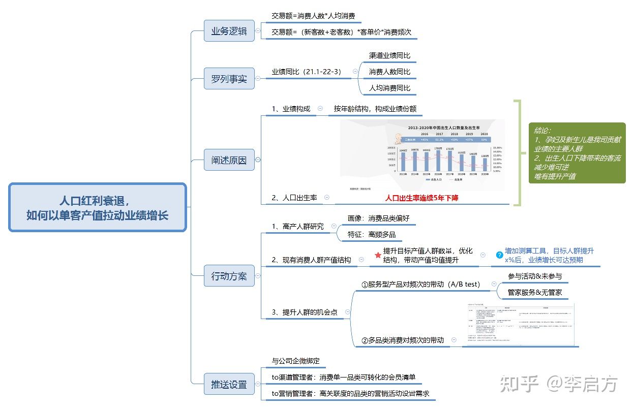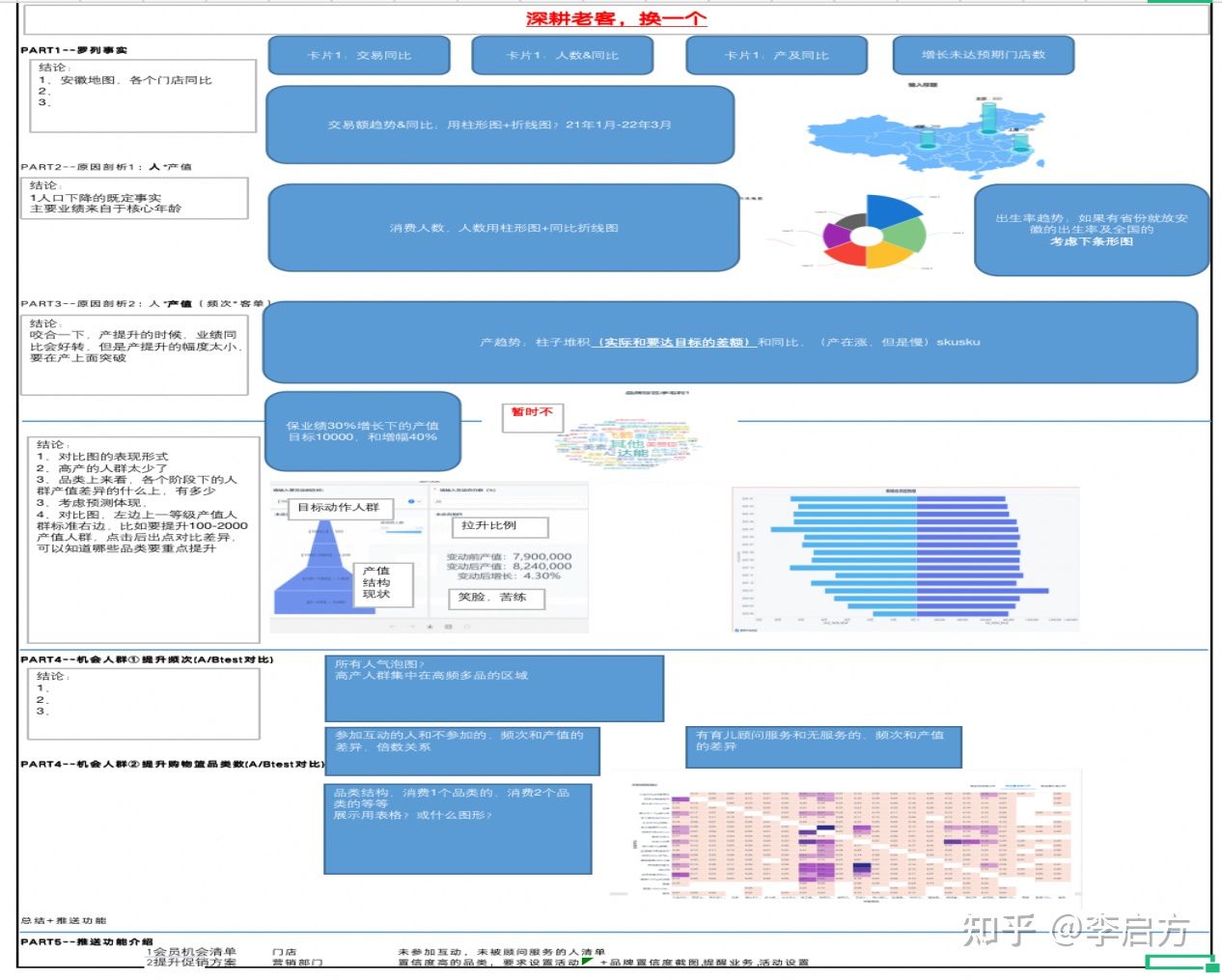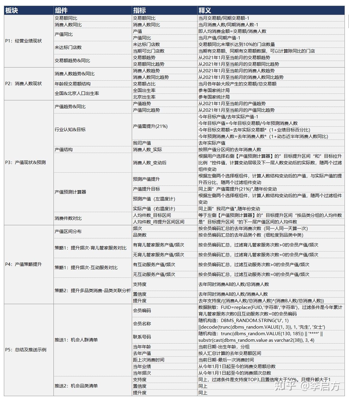 主要包括业务逻辑(例如交易额=消费人数*人均消费),现有的业绩数据构成及目标差距,如何对高产值人群进行研究,现有消费人群的产值结构(重点),所提升人群的机会点,以及如何将实时看板推送至企业管理者/门店负责人。