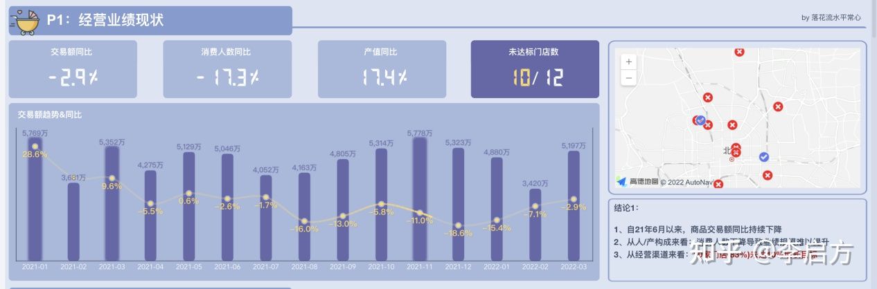 ①part1-业绩现状:展示当前实际经营结果,使用户能快速了解到业绩现状、趋势,以及问题的门店分布情况;