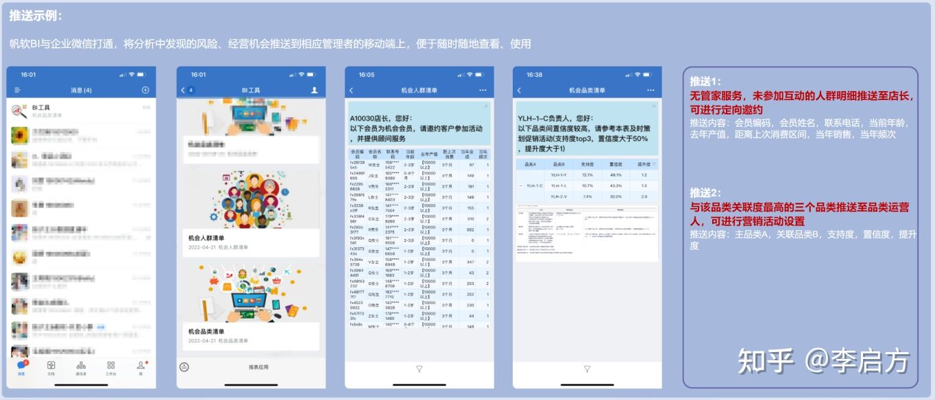 ⑤part5-总结及推送示例:我们在帆软工具实际应用场景中,与企业微信打通,将各个业务经营中发生的机会/风险以推送的方式,每日定时传递至业务责任人企业微信中。一方面可以保障重要信息及时传递,另一方面可督促业务责任人关注机会/风险事项的处理改善。本案例中将人群机会和品类关联机会推送至相关经营人企微中,实现数据使用的便利,高效。