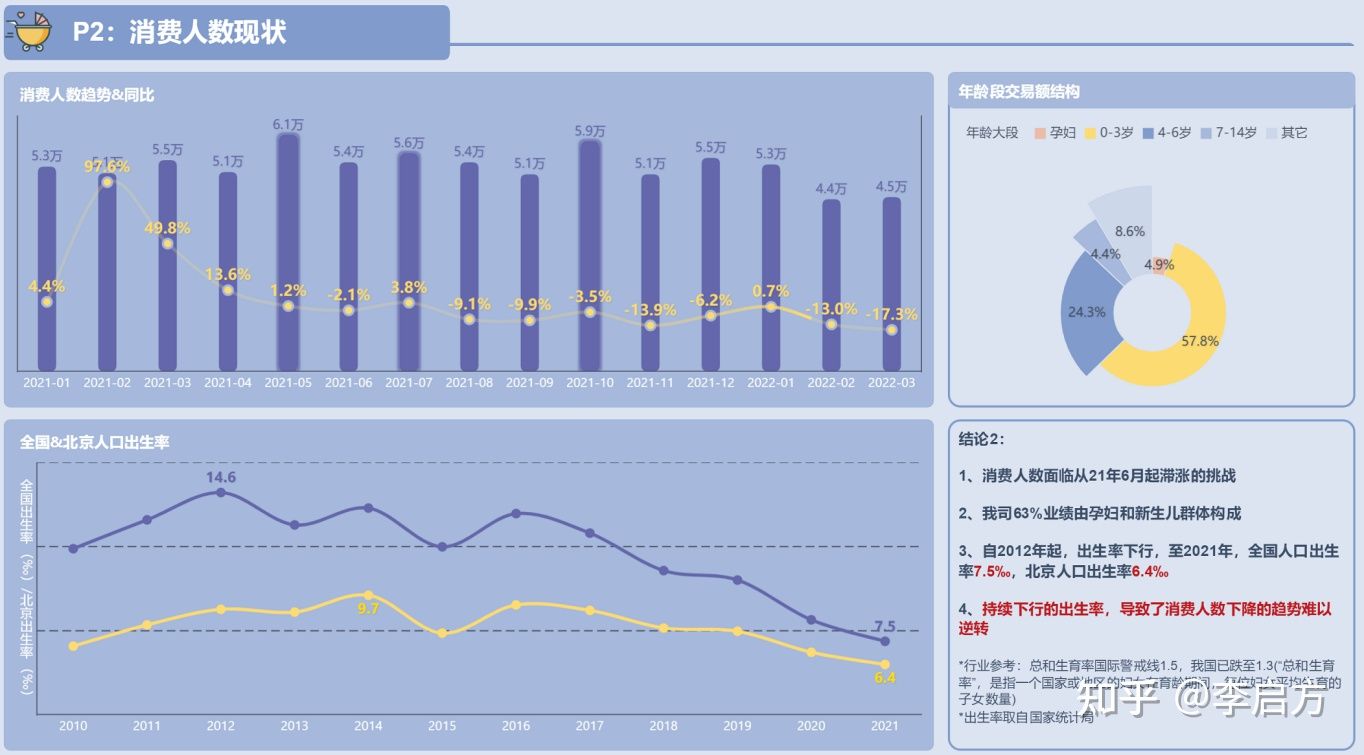 ②part2-人数现状:在了解业绩下滑后,从会员角度出发发现人数持续下降,是制约业绩的主要因素,而公司60%业绩由-1至3岁的人群贡献,结合国家/城市出生率发现人数减少的必然趋势。