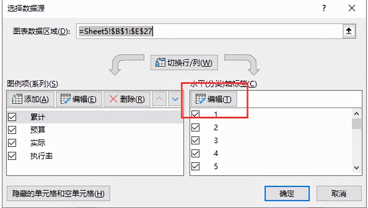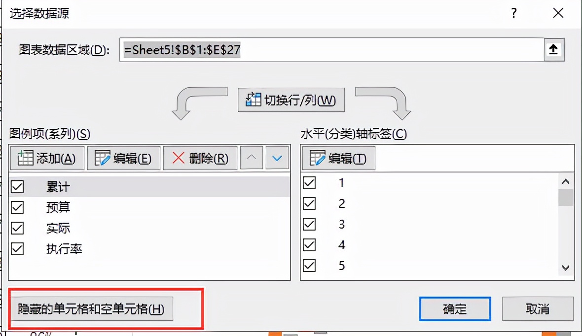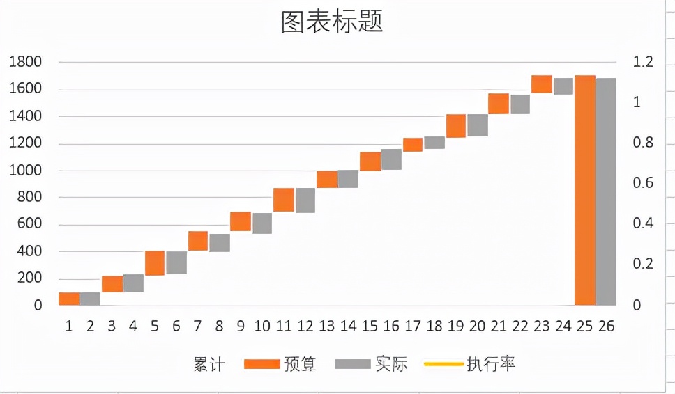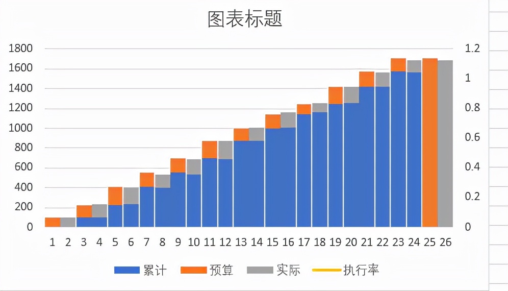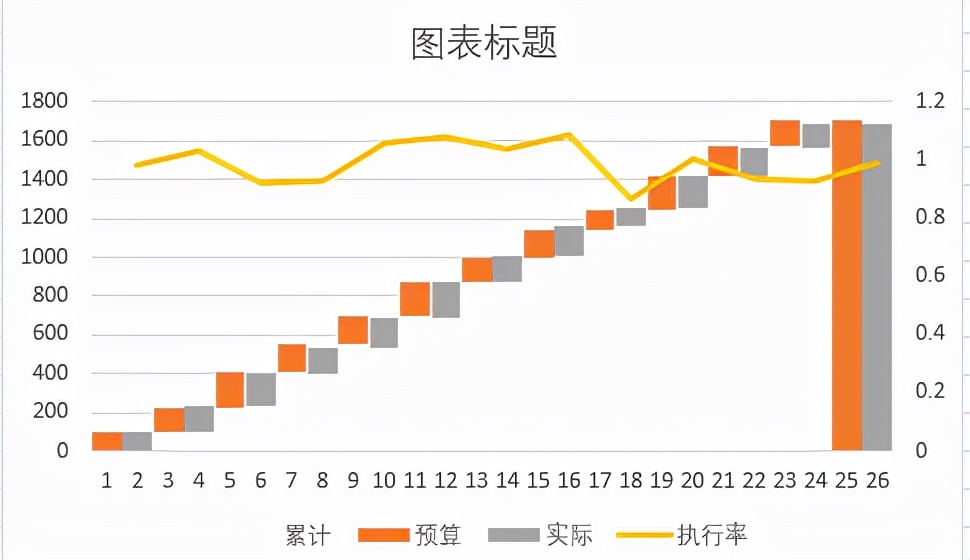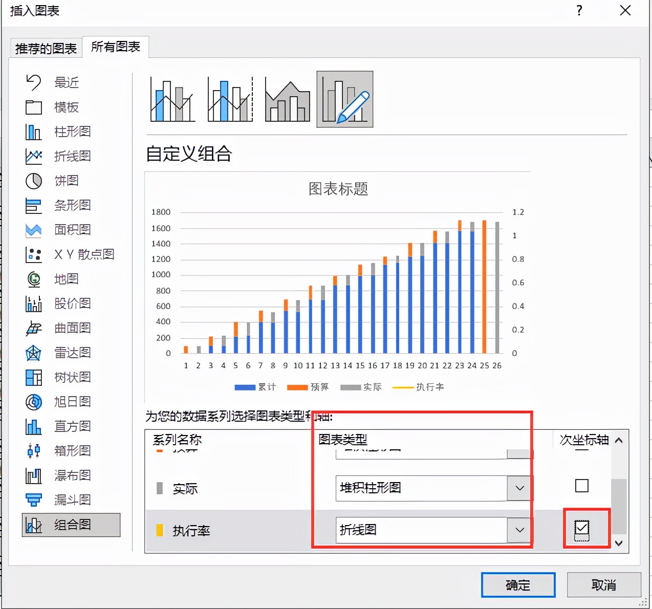 接下来我们选中B1:E27,选择插入-图表-组合图,将累计、预算、实际的图表的改为堆积柱形图,执行率改为折现图,并将折现图的次坐标轴打勾。
