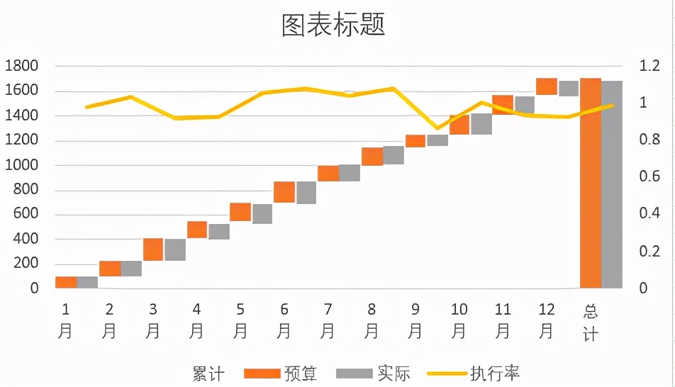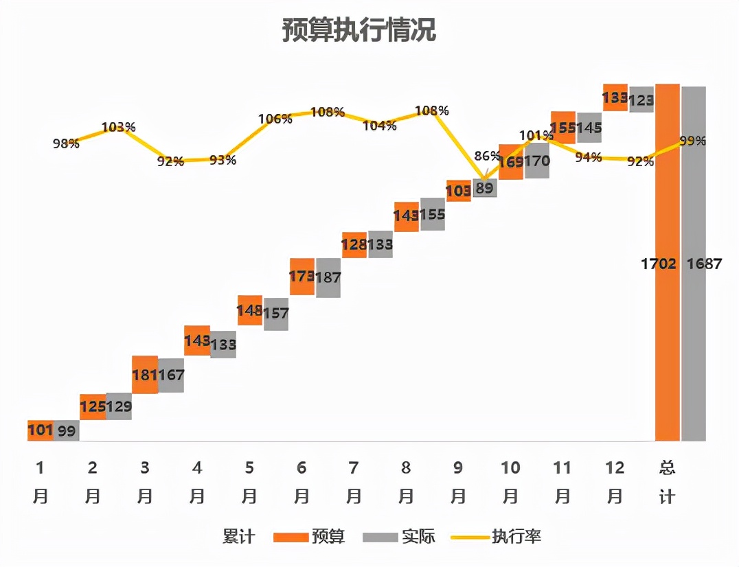 前两天看到上面的这样的图,感觉也挺好的,就试着做了一个,花了点时间,最后也算完成了,有点瀑布图的感觉,与一般瀑布图的区别是两个柱子,所以有人叫它为双柱瀑布图,而且还添加了折线图来看完成率。