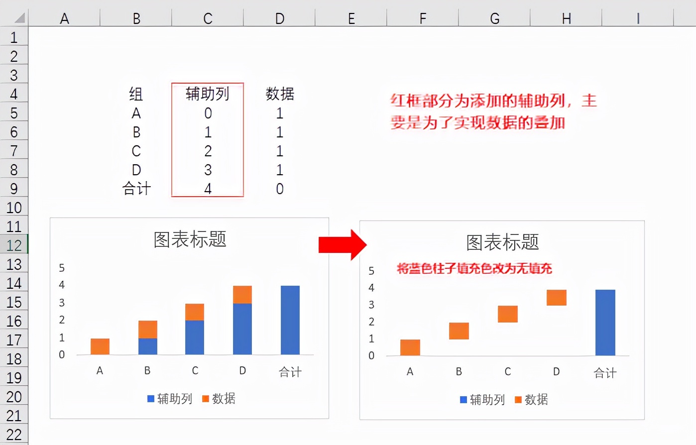回到刚才的图表制作上来,由于是双柱,所以需更多的辅助列或行,做成下面的表