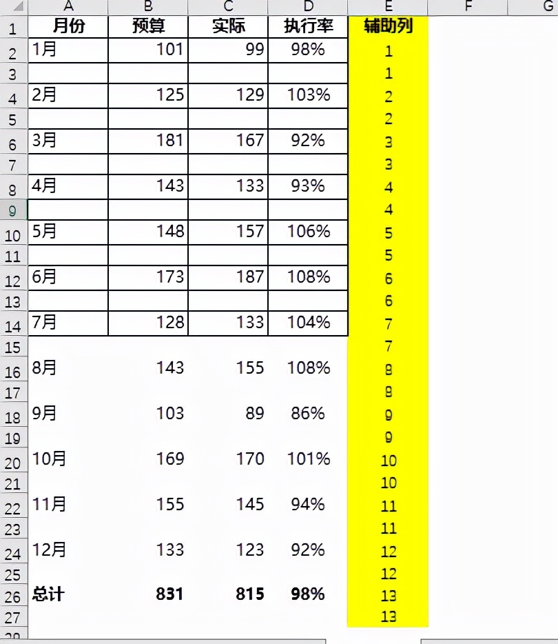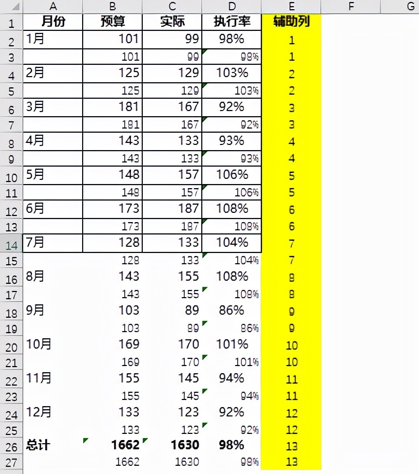 很多人可能不太会使OFFSET函数,我们可以通过添加辅助列来快速实现,在原表的后方添加一列连续的数字1-13,然后再下面将1-13复制。