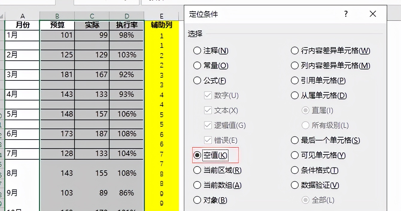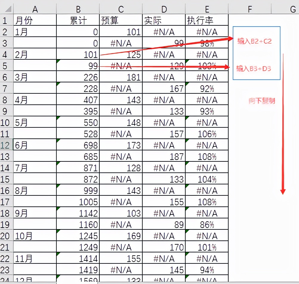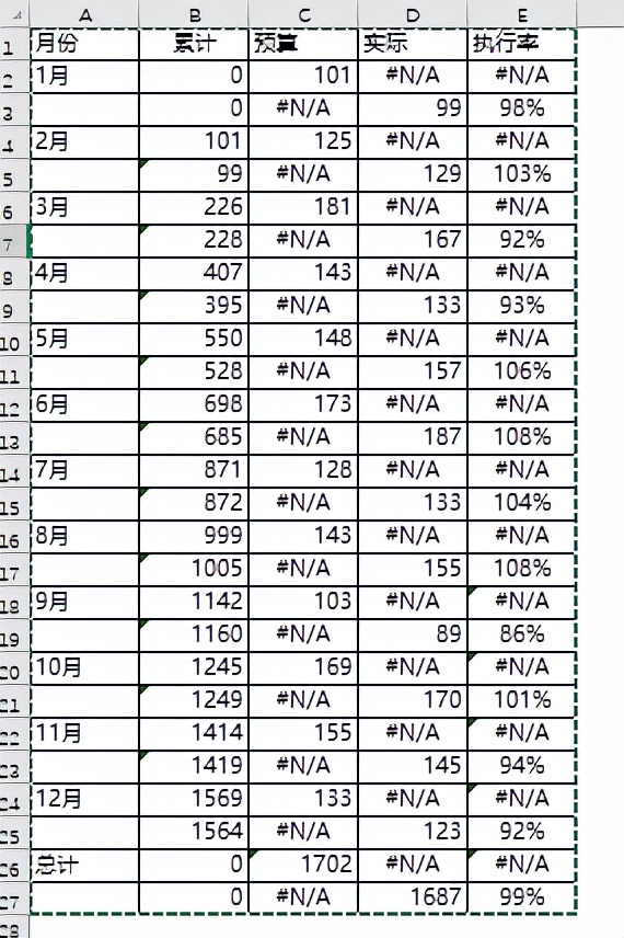 接下来对B2:D27进行贴值,使其不再是公式,然后通过,筛选月份的空白将相关数据替换为#NA,可以使用刚刚的定位下的可见单元格,或直接使用ALT+;,输入#NA,然后按下CTRL+ENTER完成批量操作,做成开头的第2个带辅助行和列样式,预算和实际进行错位。