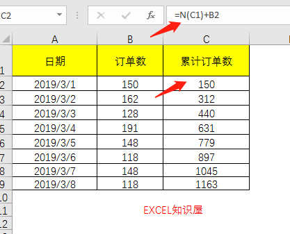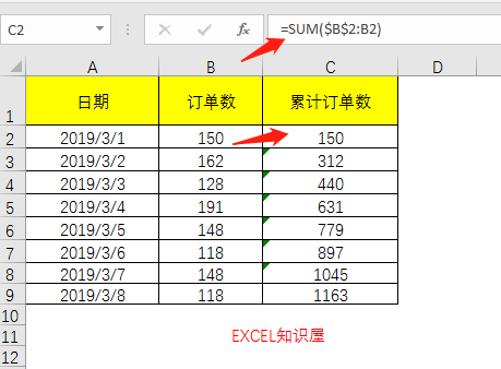 累计订单数求和,输入公式:=SUM($B$2:B2)
