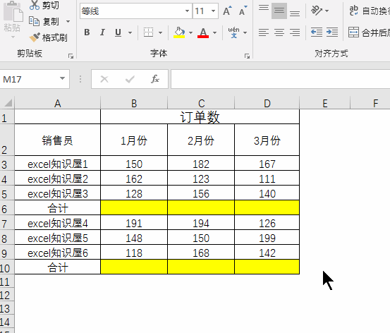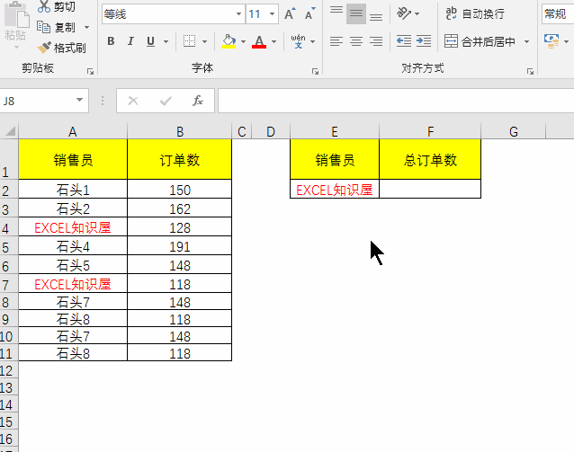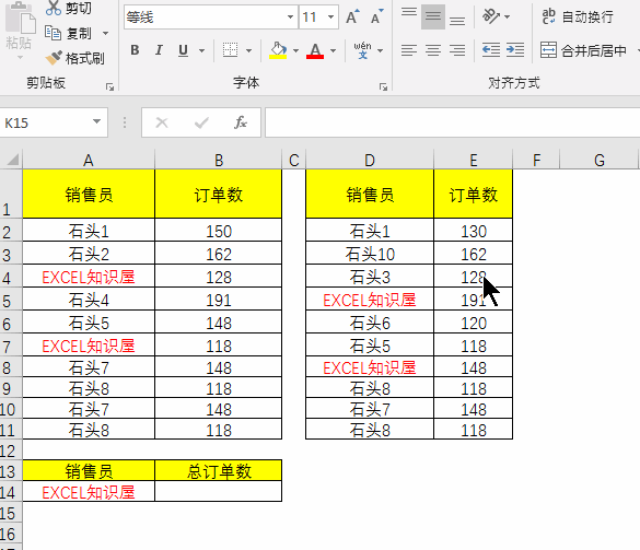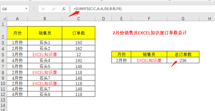 求销售员为EXCEL知识屋的总订单数。SUMIF函数可以跨文本求和。