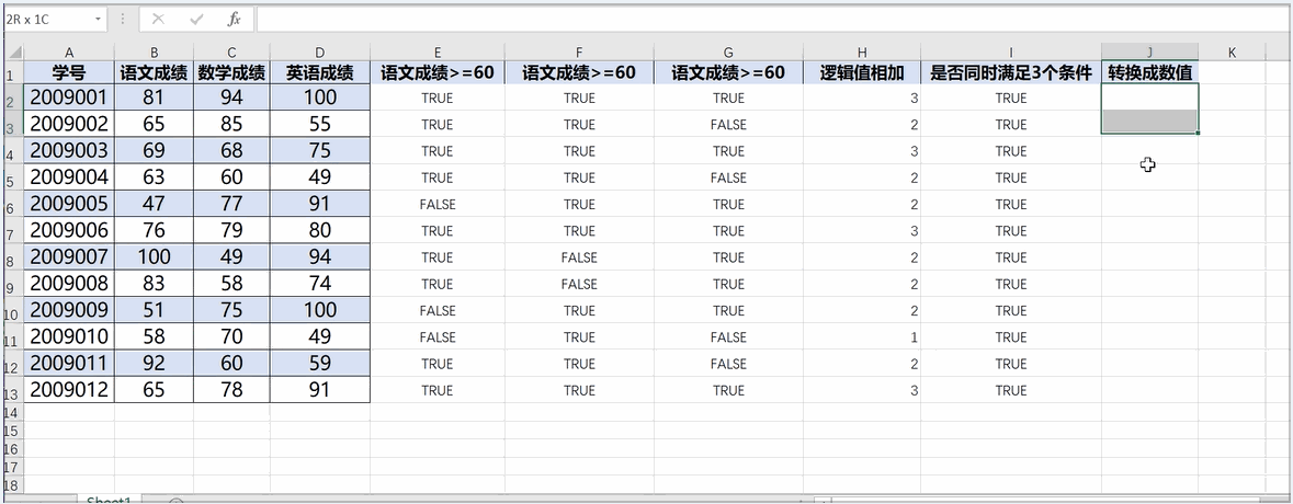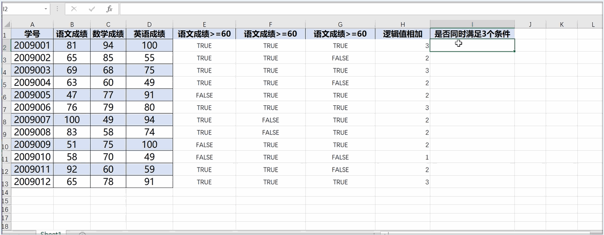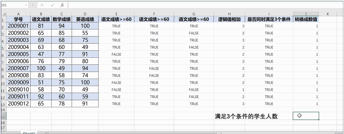 比如,想要统计下表中任意一门成绩大于等于60分的学员数。