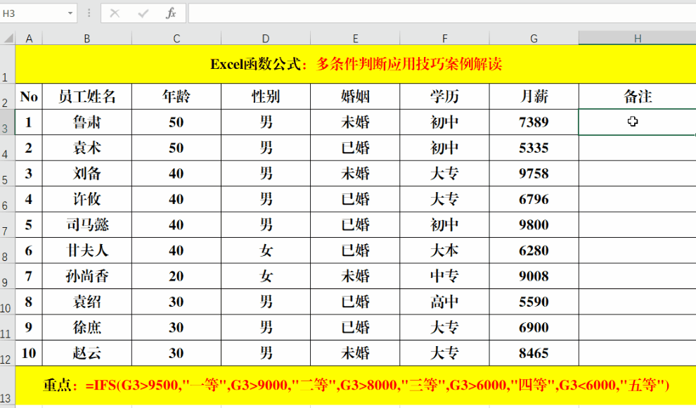 在目标单元格中输入公式:=IFS(G3>9500,"一等",G3>9000,"二等",G3>8000,"三等",G3>6000,"四等",G3<6000,"五等")