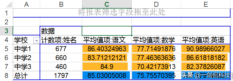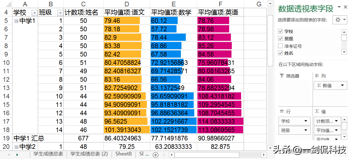 选中成绩表里的任一单元格,单击菜单栏中的【插入】-【数据透视表】,在数据透视表中,选择学校、姓名、语文、数学和英语字段,将姓名设置为“计数值”,其它的设置为“平均值”,再设置各数据的条件格式,就完成了。