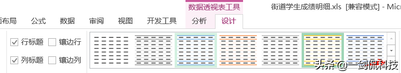 选中左边数据表的任一单元格,单击【数据透视表工具】-【设计】,选择右下角的下拉三角形,可以得到表格的各种设计模板。