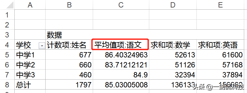 2)可以看到各学校的参考人数已经统计出来了,只是当前默认得到的是各学科的总分,要将其改变平均分,怎样操作?