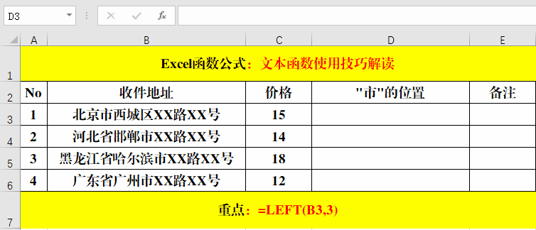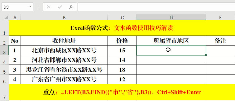 公式中使用Find函数查找“市”和“省”的位置,然后利用Left函数提取查找到的位置的左侧字符即可,但由于B列地址中可能有市,也可能有省,所以在Find函数中使用了一个常量数组{"市","省"},可以同时查找“市”和“省”。