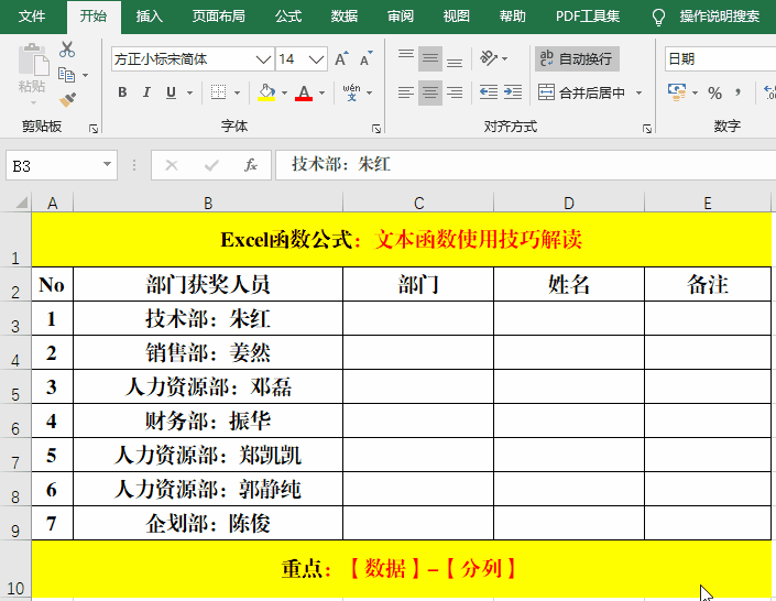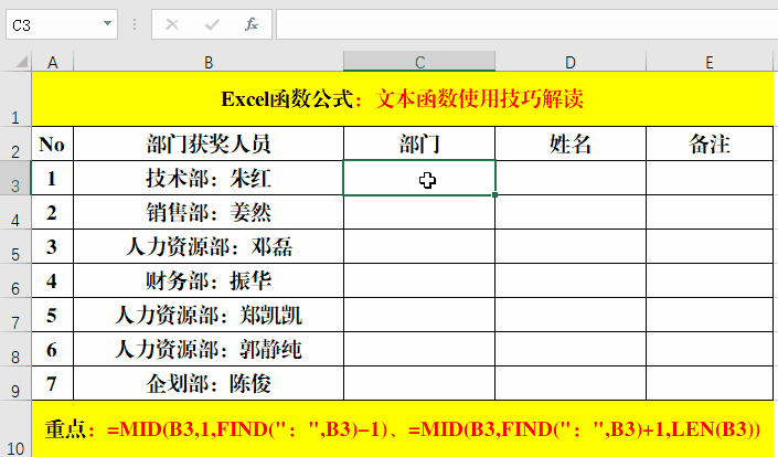 公式=MID(B3,1,FIND(":",B3)-1)中,首先利用Find函数获取“:”的位置,然后-1进行修正,也就是“部门”的长度,然后用Mid函数进行提取;公式=MID(B3,FIND(":",B3)+1,LEN(B3))中,同样也是用Find函数获取“:”的位置,然后+1进行修正,也就是“姓名”的起始位置,然后用Len获取字符串的总长度,来填充Mid函数的第3个参数,因为要提取的字符串最长也就是字符串长度。