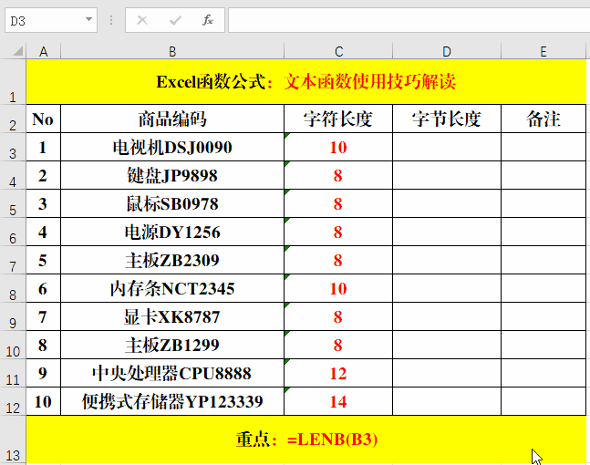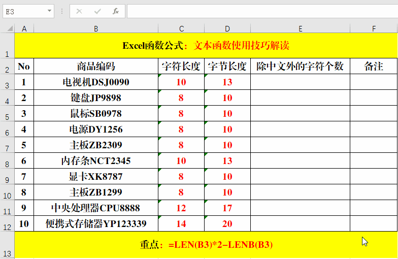 对于公式的理解,可以先从结果入手,例如第一个字符串“电视机DSJ0090”中除中文外的字符长度为7,而7=字符长度-中文长度,即7=LEN(B3)-(LENB(B3)-LEN(B3)),整理之后的公式为=LEN(B3)*2-LENB(B3)。